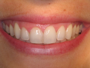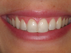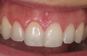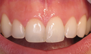 Sometimes crown lengthening is done to improve a "gummy" smile because the teeth appear short. The teeth may actually be the proper length but excess gum tissue may be covering these teeth. During this procedure, excess gum and bone tissue is reshaped to expose more of the natural tooth. Below is a case that involved a subtle change on just two teeth. See if you can spot the difference.